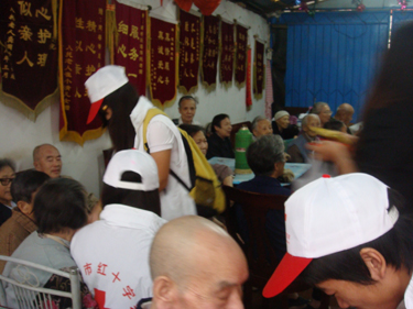 ??????? 2011年9月10日,在中秋佳节即将来临之际,武汉市红十字会为响应市文明办在全市开展的“我们的节日—中秋”主题活动,营造文明、和谐、喜庆节日气氛,弘扬“人道、博爱、奉献”的红十字精神,组织红十字志愿者开展了“我们乐助夕阳红”—中秋送温暖活动。
